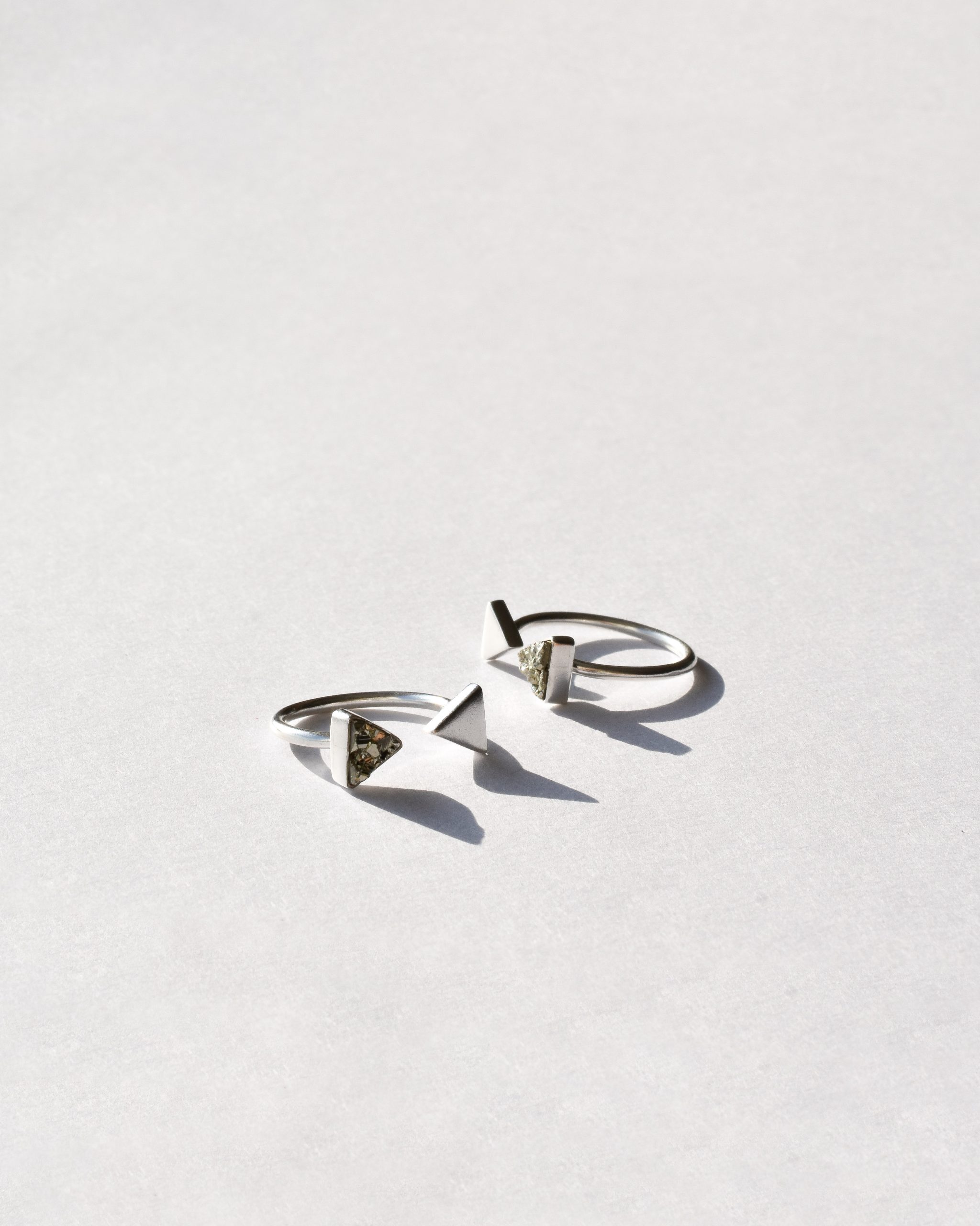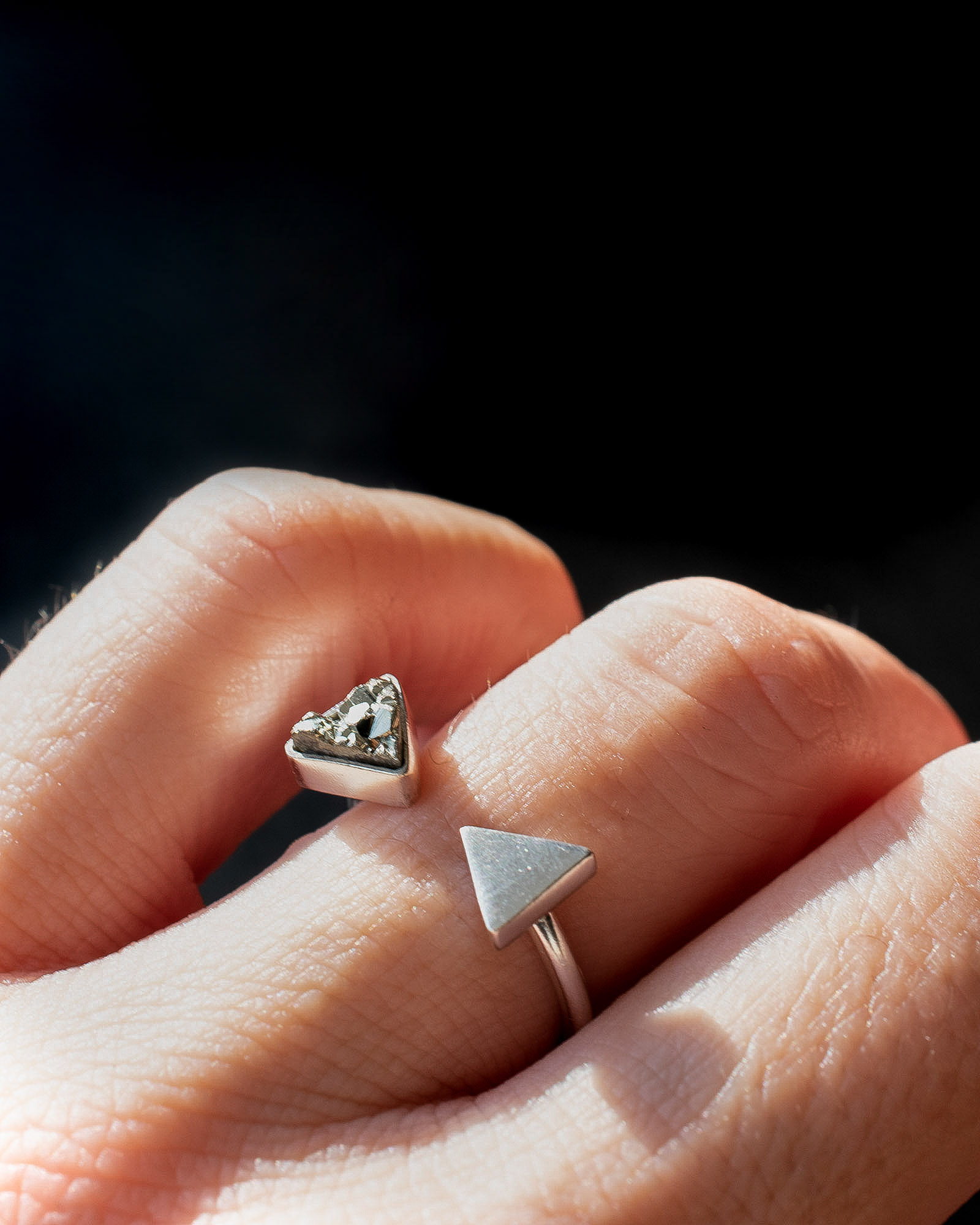 Nos encanta crear anillos de estilo minimalista y delicado, ya que son perfectos para cualquier tipo de ocasión, y son súper combinables. Elaborado en plata 950 y pirita triangular. Elegimos la pirita pues es una piedra que tiene un brillo especial, además de unas magníficas propiedades.
