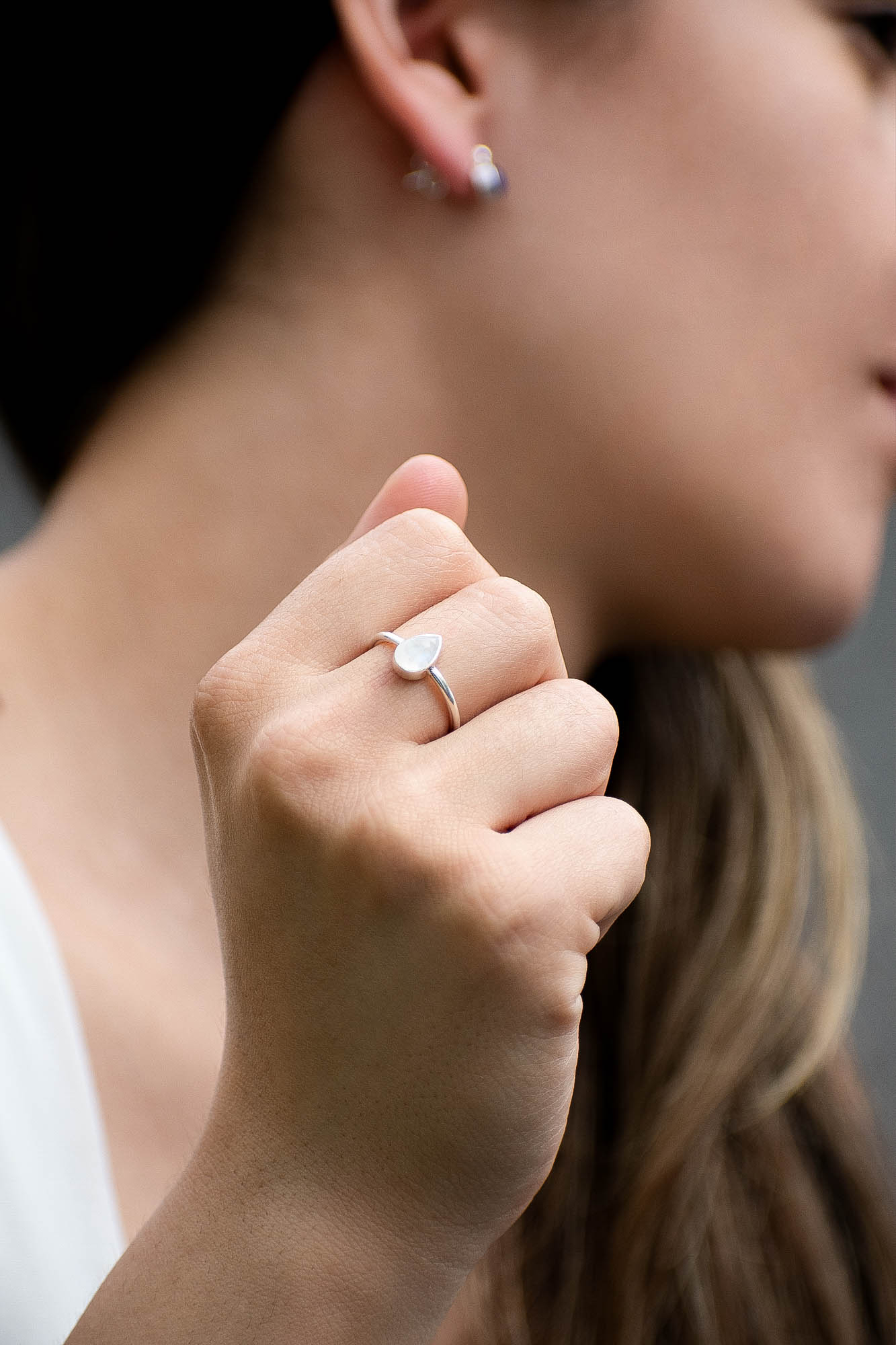 Este hermoso anillo elaborado en plata sostiene una piedra luna en forma de pequeña gota, conocida por su brillo suave y su energía tranquila.