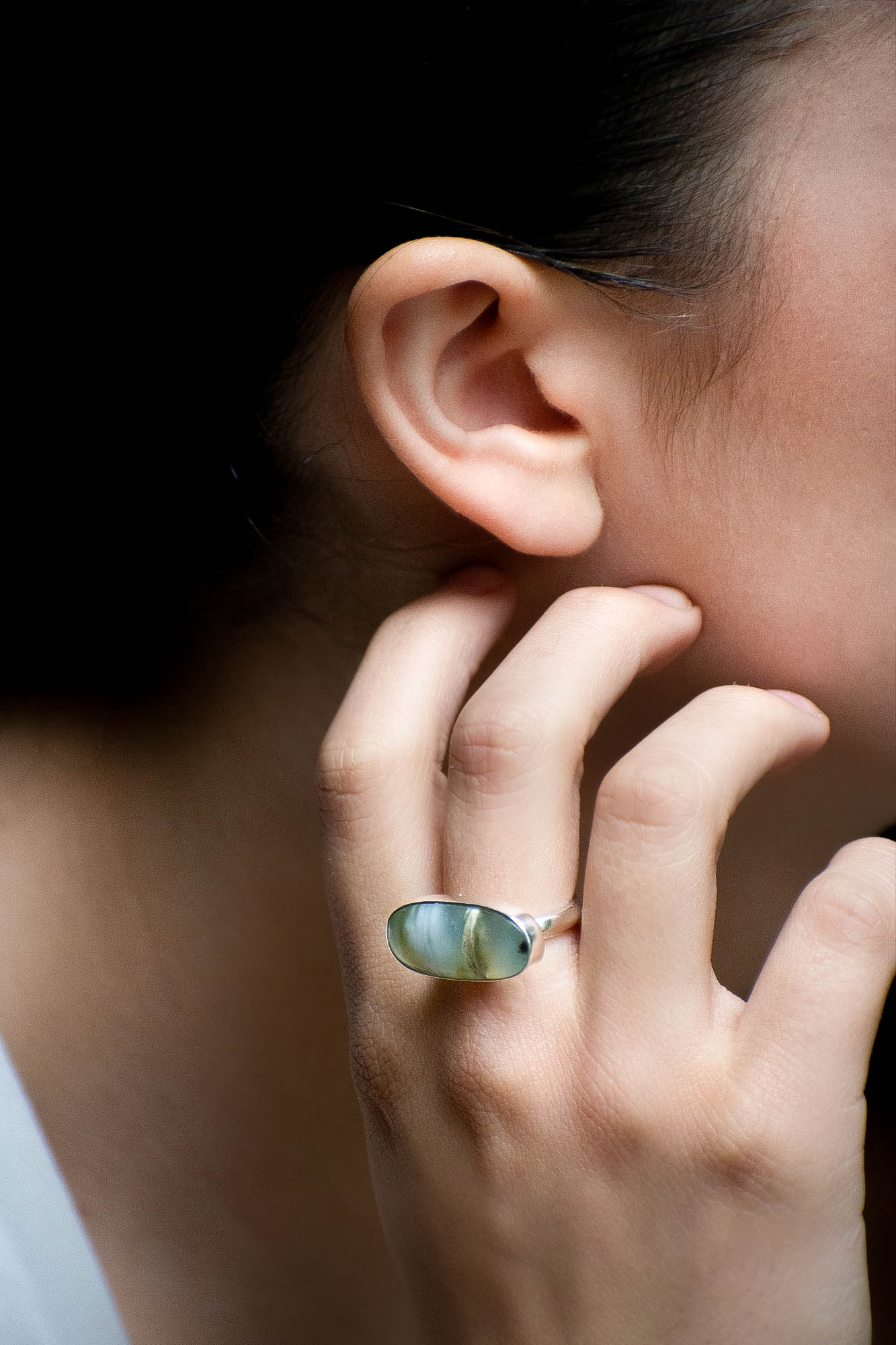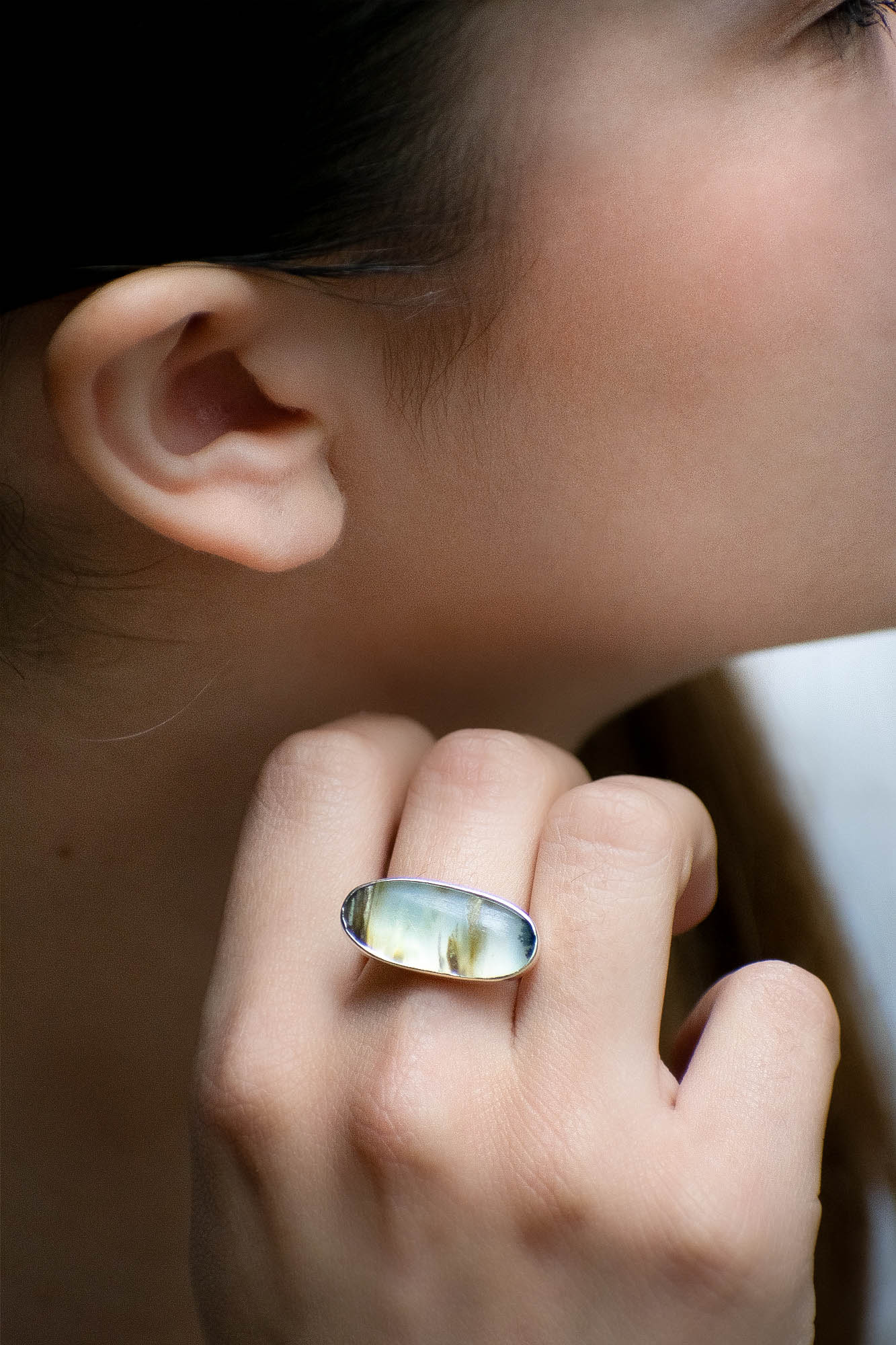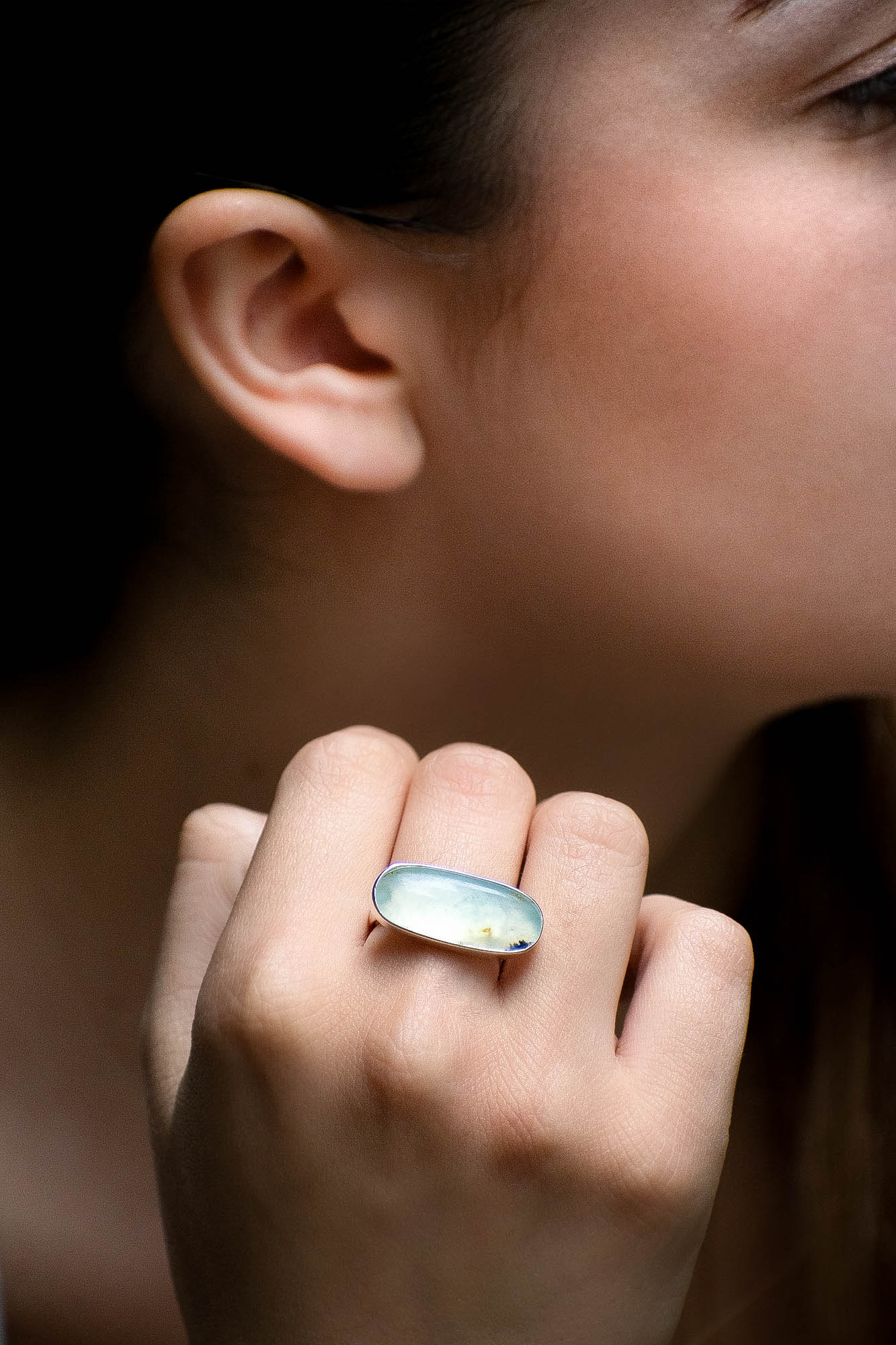 Lleva contigo un poco de los andes con nuestro anillo Niebla, elaborado en plata y engastados con auténtica piedra ópalo andino en forma ovalada. Cada pieza es única e irrepetible, gracias a sus vibrantes y cambiantes tonalidades, cada piedra es como un pequeño universo encapsulado.
