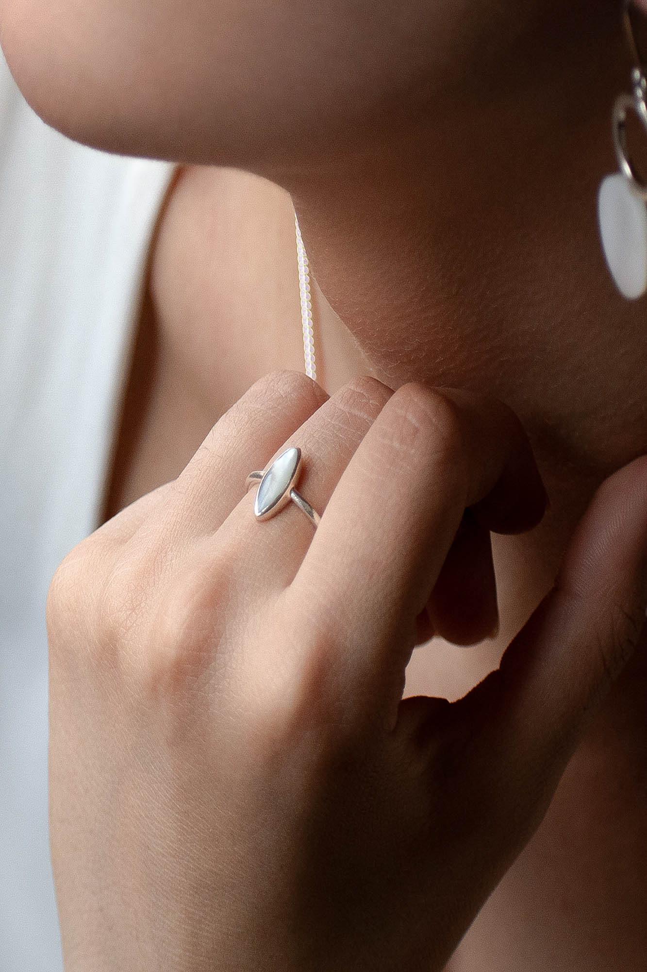 El anillo Pluma es una joya que encarna sutileza y pureza. Su diseño delicado en plata 950 sostiene un nácar en forma de almendra, fino y luminoso, que refleja la luz con una suavidad casi etérea.