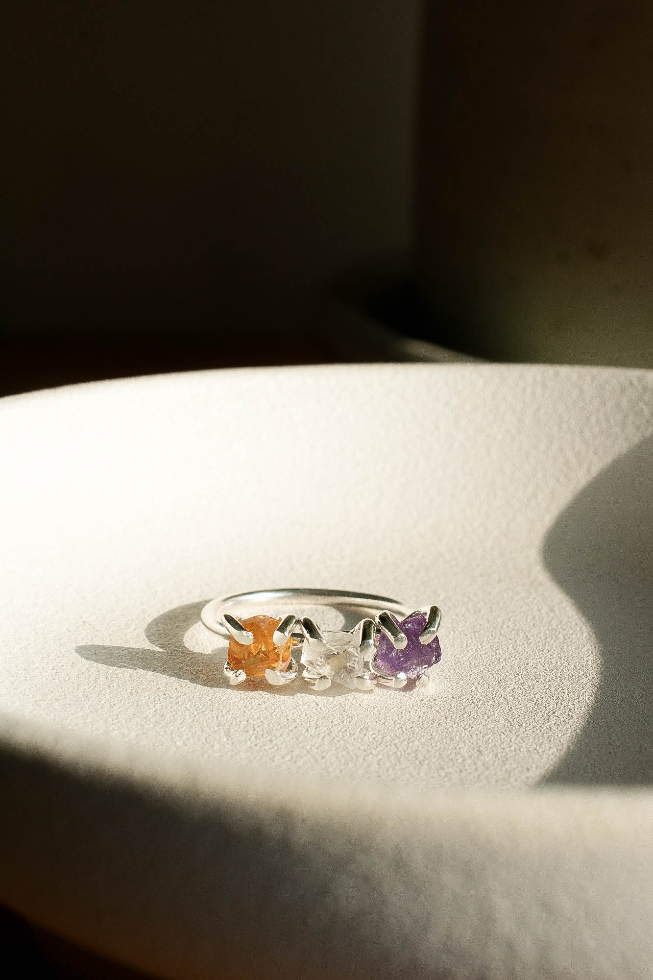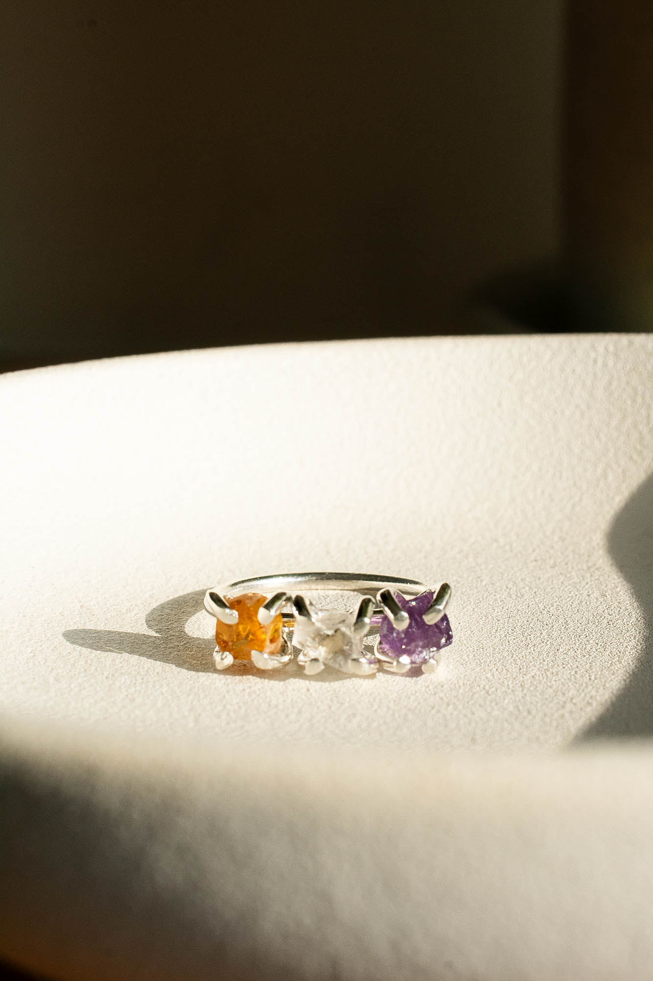 El anillo TRINIDAD combina la energía de tres piedras en su estado natural: citrino, cuarzo cristal y amatista, creando una pieza equilibrada que integra luz, calma y vitalidad.