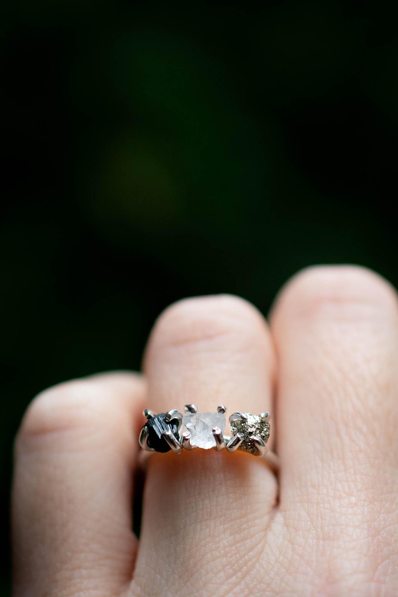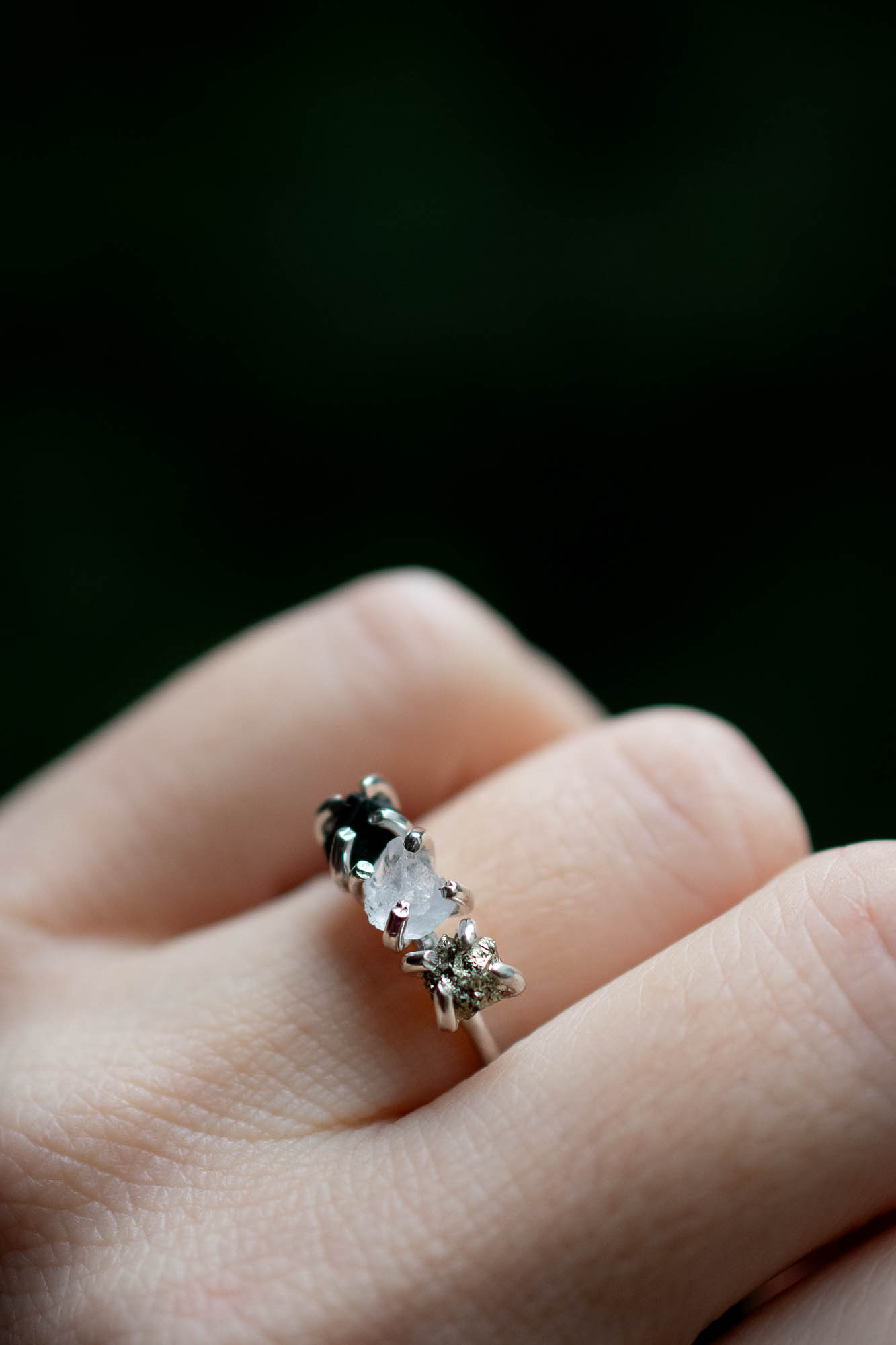 Ideal para combinarlo con la pulsera del mismo nombre, nuestro anillo Trinidad está diseñado para quienes buscan llevar consigo un amuleto de protección, energía y claridad. Combina tres piedras en su estado natural, cada una con un poder especial que se complementa con las otras.