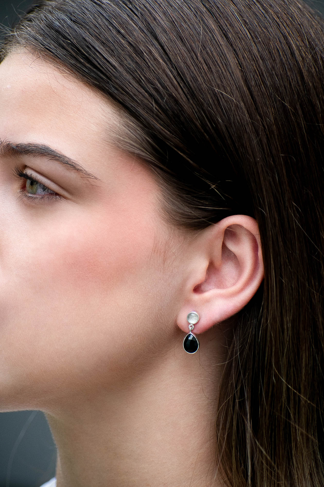 Los aretes Kairo combinan dos energías complementarias en un diseño sofisticado: un cuarzo cristal circular y un ónix negro en forma de gota facetada.