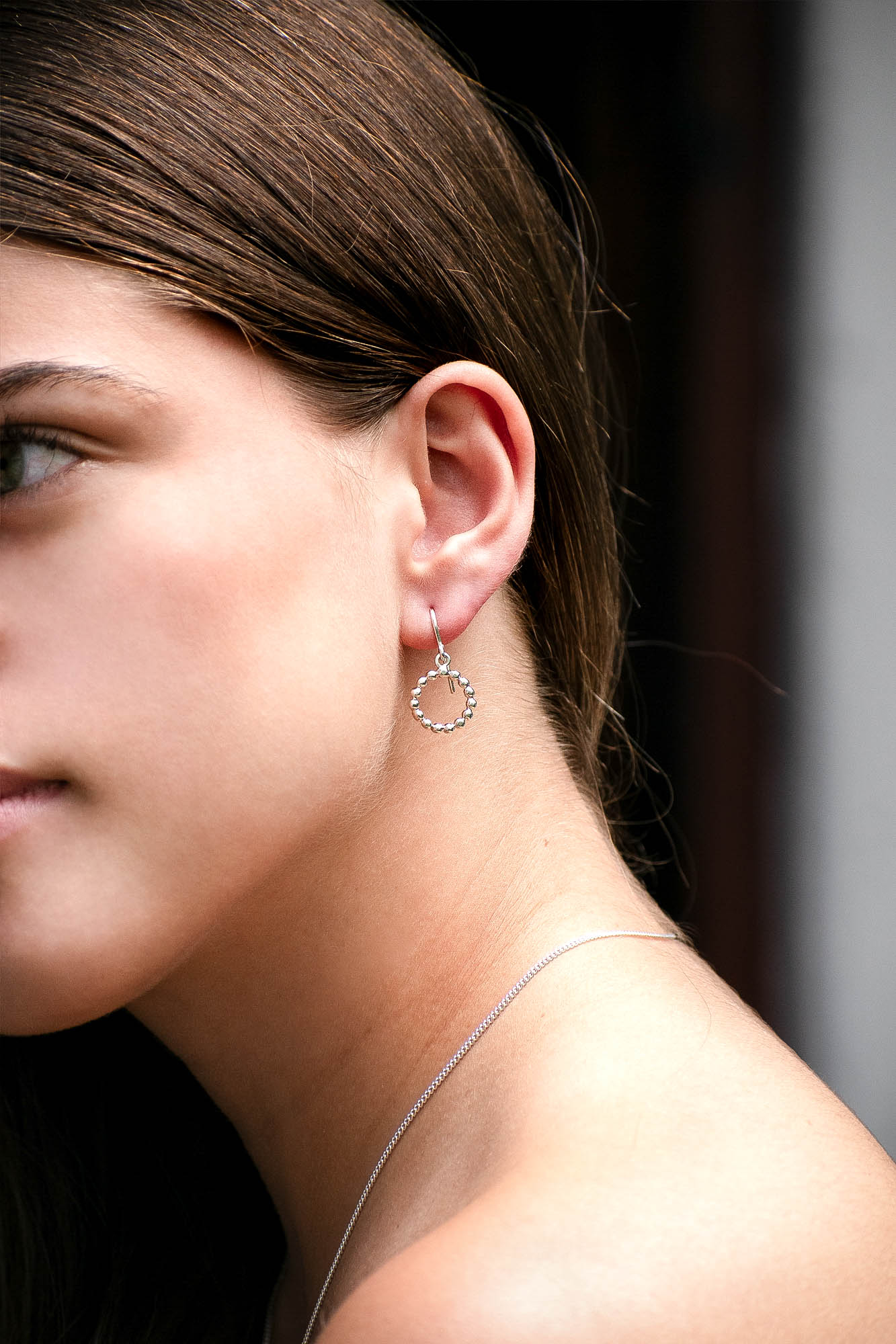 Los aretes Raon destacan por su diseño limpio y contemporáneo, formado por un círculo compuesto por múltiples esferitas que crean una estructura delicada pero con presencia.