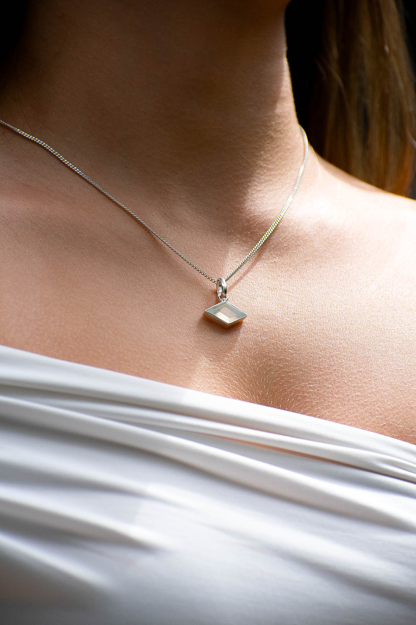 El collar ENYA es una pieza sutil y luminosa que destaca por su ópalo andino en forma de rombo facetado. Su geometría aporta equilibrio y estructura, mientras que el facetado permite que la piedra capture la luz con cada movimiento.