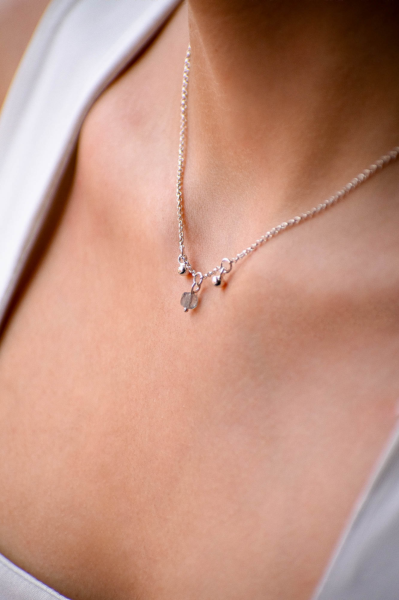 El collar Lux irradia sutileza y luz interior. Su diseño delicado combina dos pequeñas esferas colgantes con una labradorita facetada en forma de cubo , una piedra que brilla con reflejos cambiantes, como un misterio atrapado en la luz.