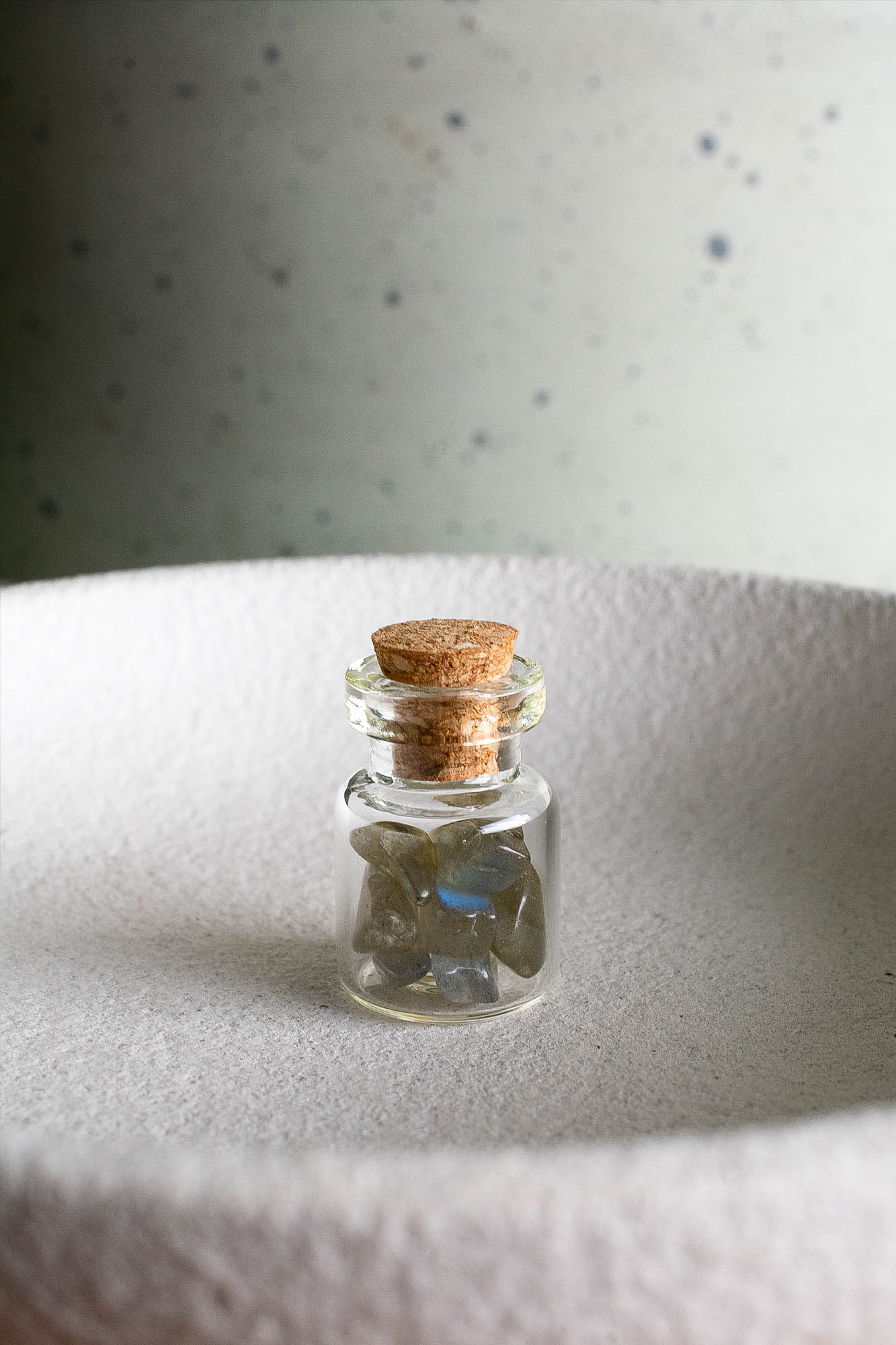Un pequeño frasco lleno de magia sutil: tu Mini Jar Labradorita te acompaña a confiar en tu luz propia.