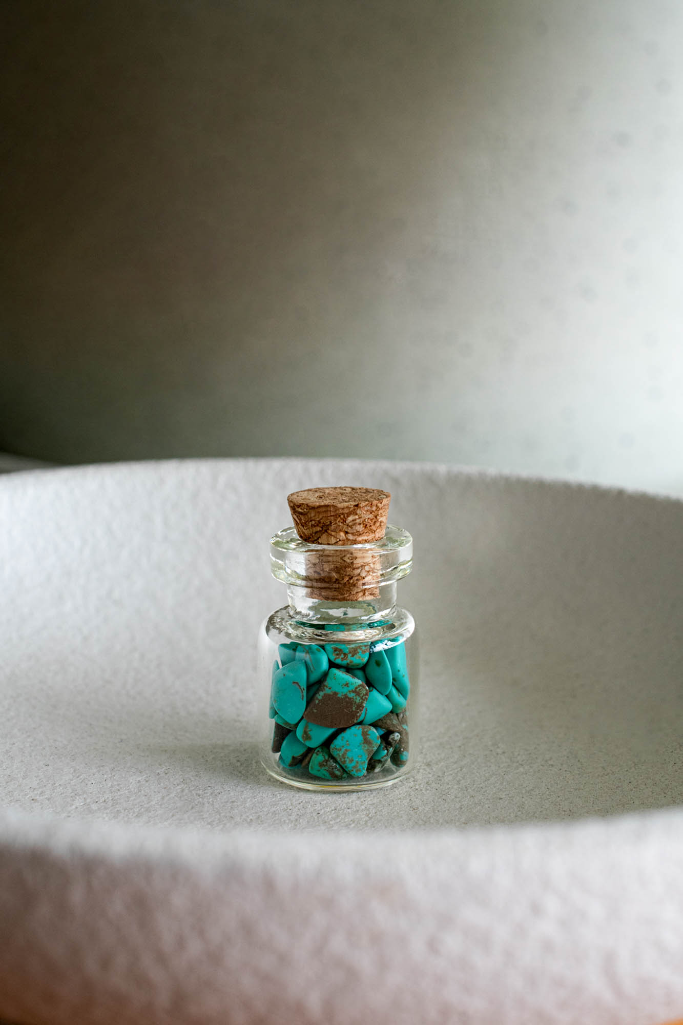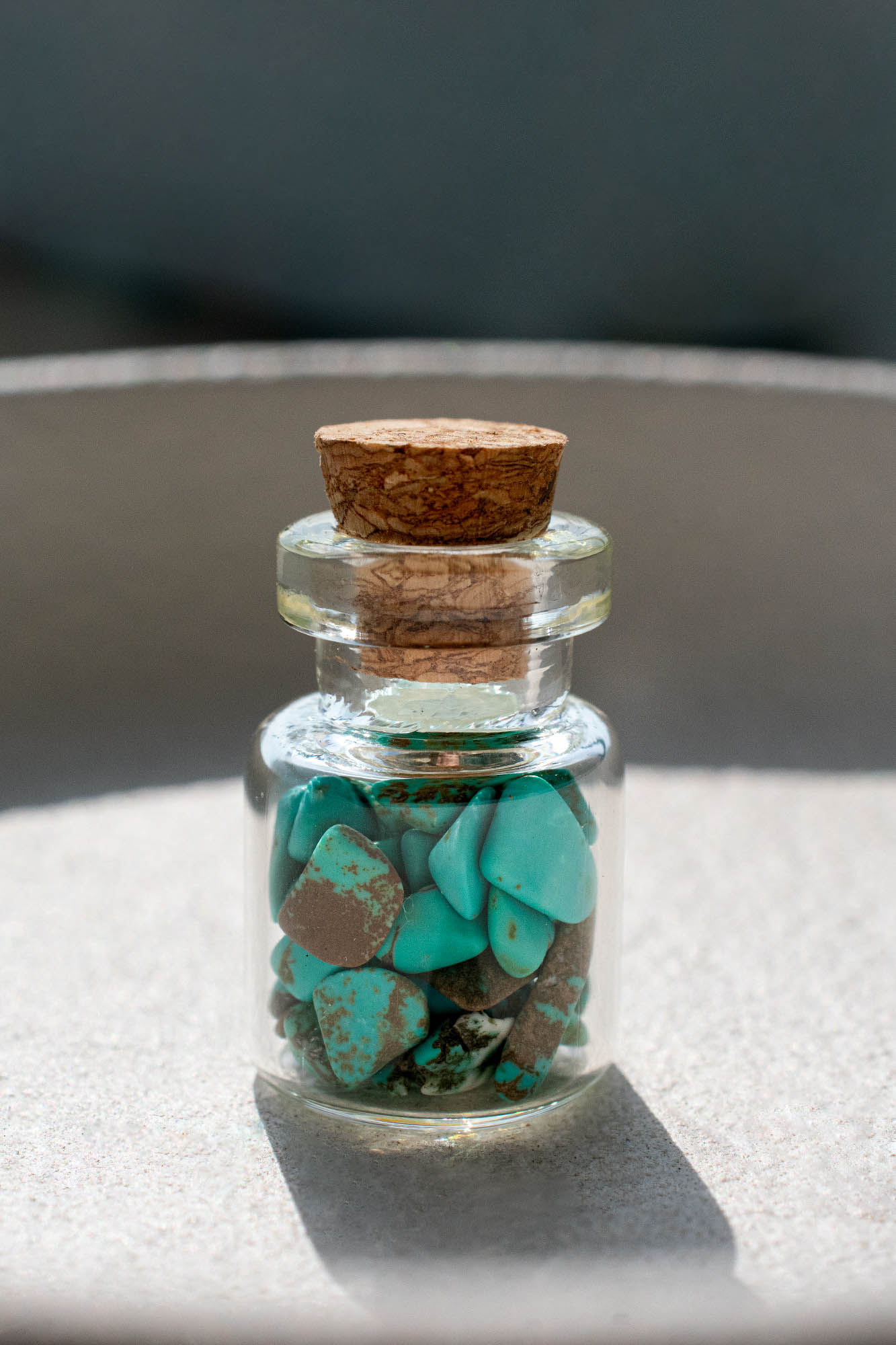 Este mini jar tipo amuleto contiene piedras naturales de turquesa, una piedra sagrada utilizada por culturas ancestrales para la sanación y la conexión espiritual. Ideal para quienes buscan armonizar cuerpo y alma, y mejorar su expresión personal.