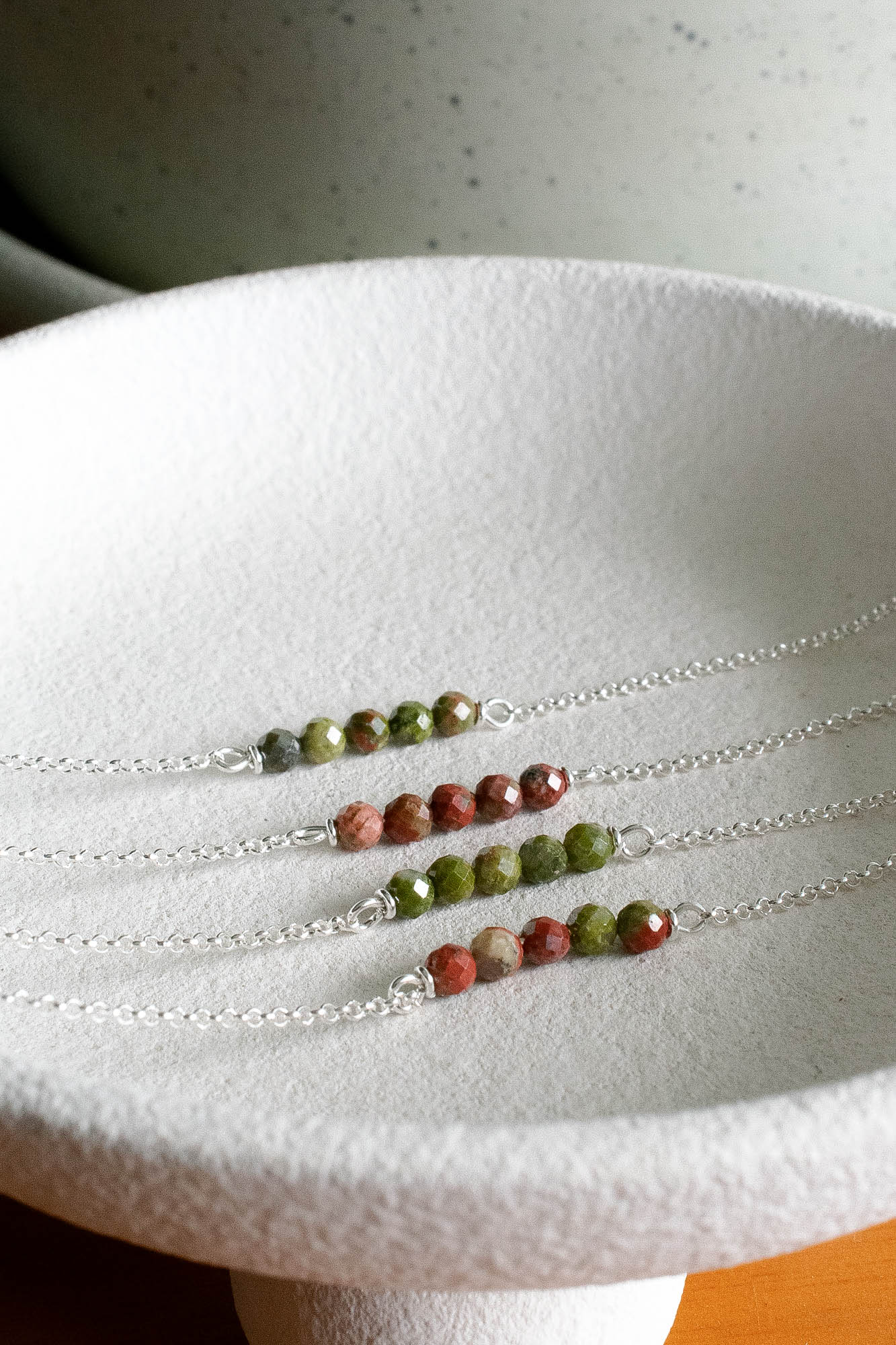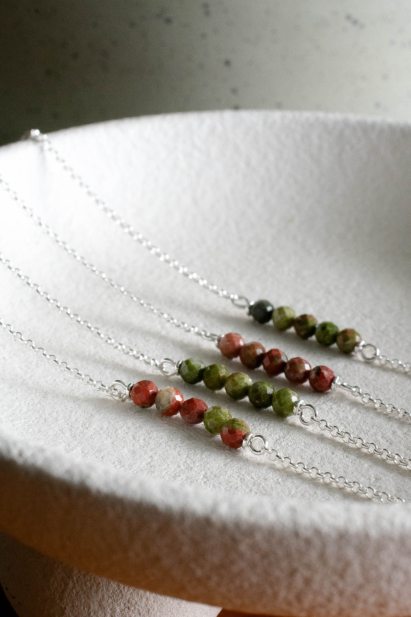 Cada pulsera es única: los tonos pueden variar entre matices verdes, rosados o combinados, reflejando la belleza natural e irrepetible de cada piedra.