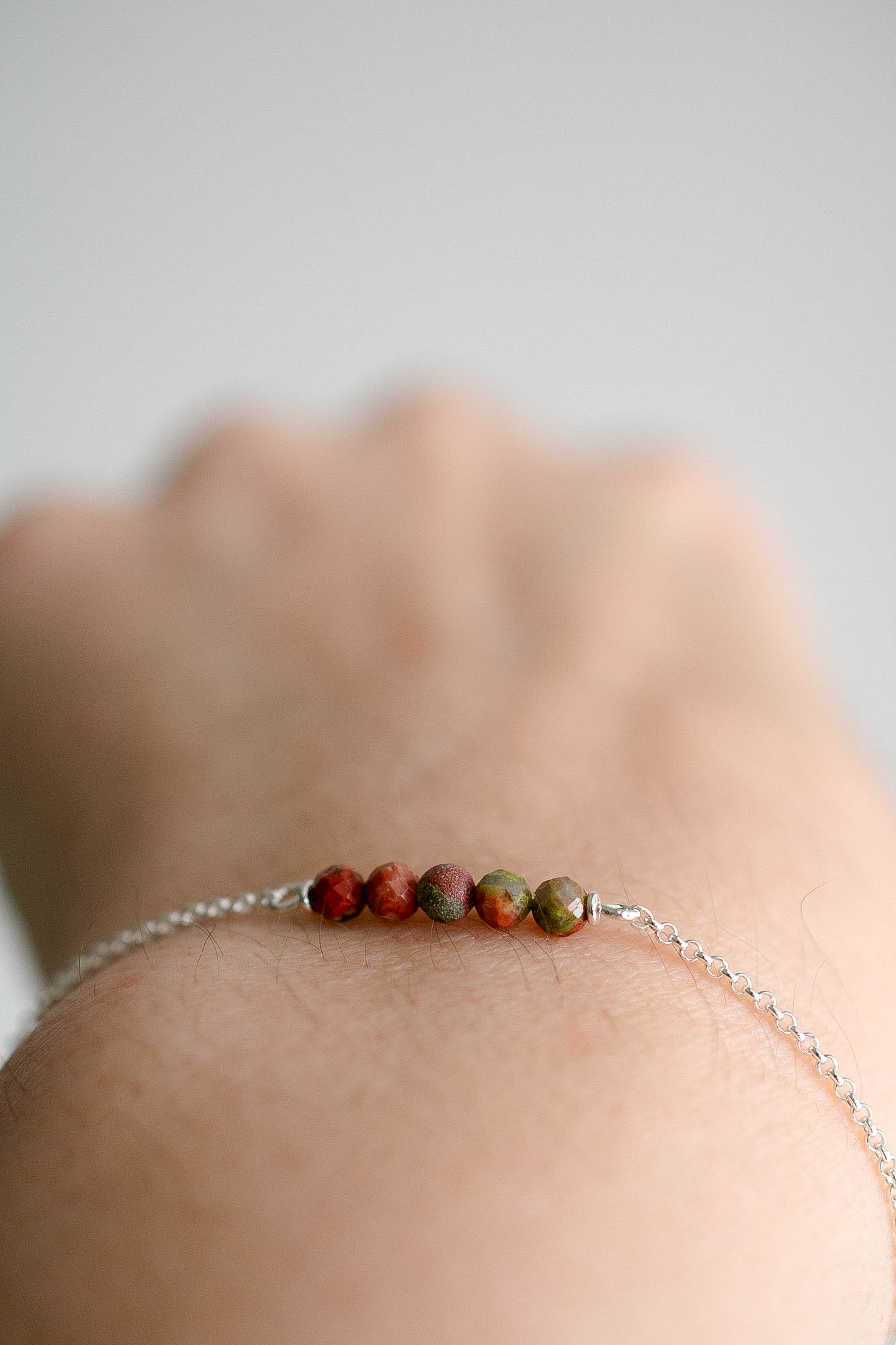 La pulsera Ábaco equilibra energía, armonía y propósito. Su nombre evoca el antiguo instrumento de conteo, símbolo de orden, claridad y conexión con el presente. En ella, cinco piedras de Unakita facetada se alinean con suavidad, recordando que cada paso, cada decisión, cuenta en el camino del crecimiento interior.