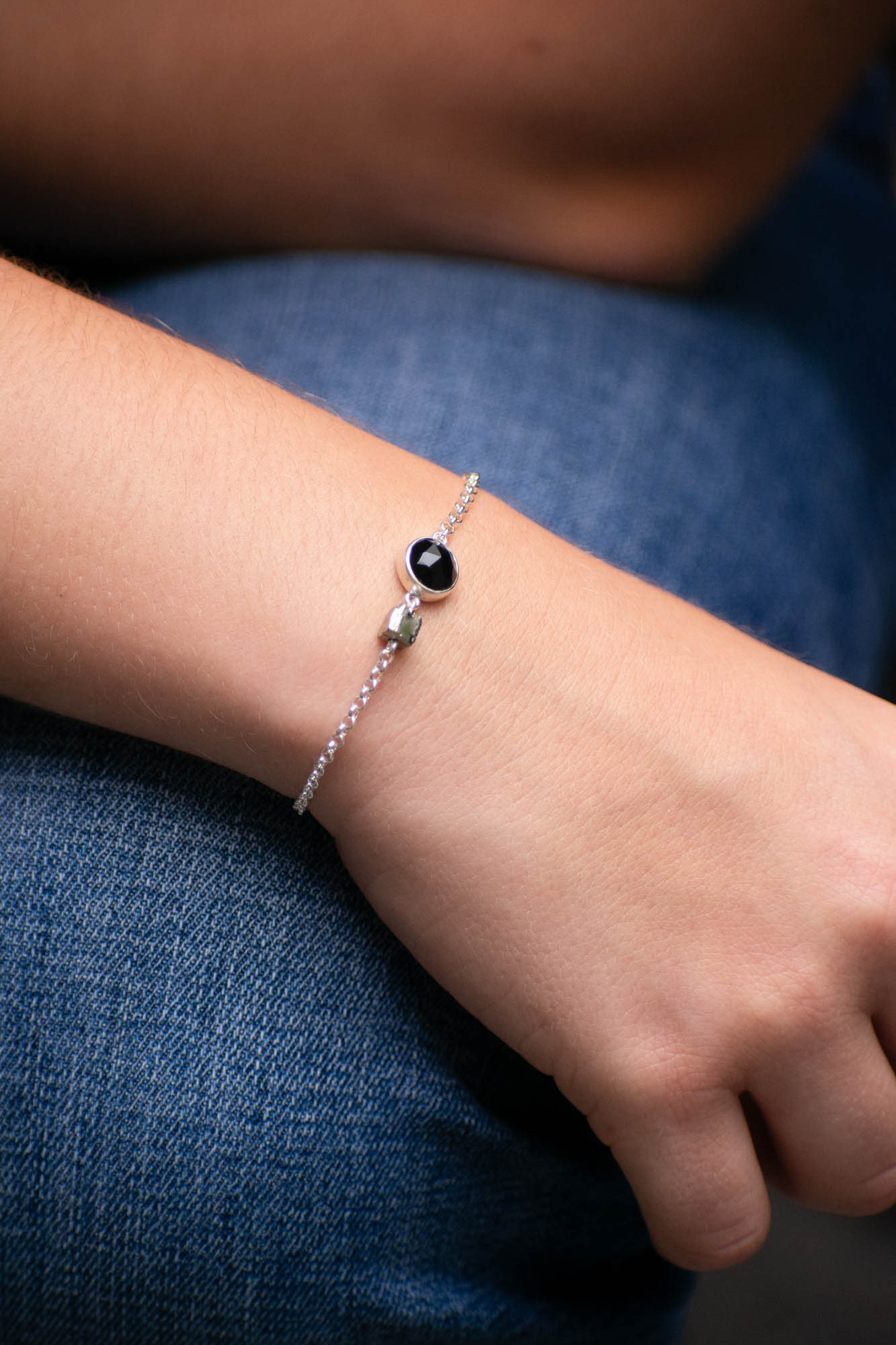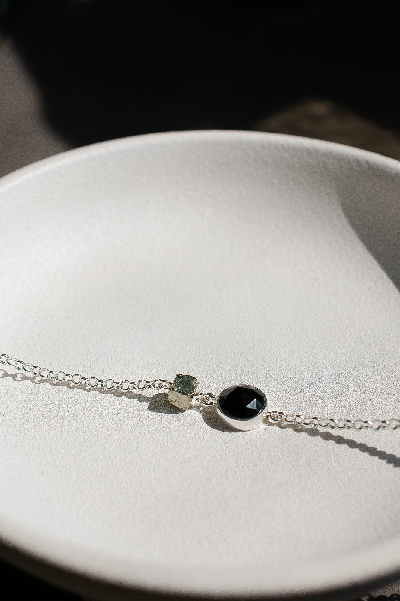 Centella es una pulsera de carácter intenso y protector. Combina ónix negro facetado, conocido por absorber y transformar las energías densas, con pirita en estado natural, una piedra asociada a la protección, la fortaleza interior y la atracción de la abundancia.
