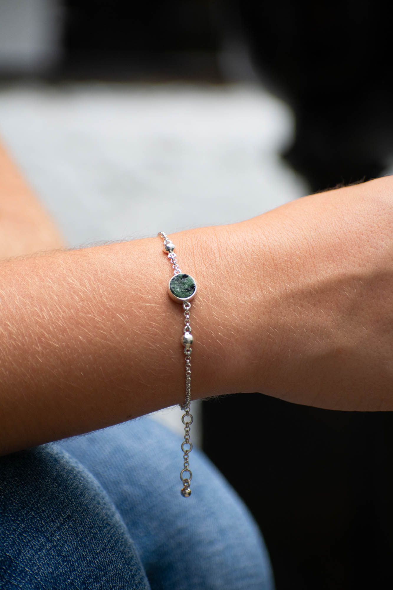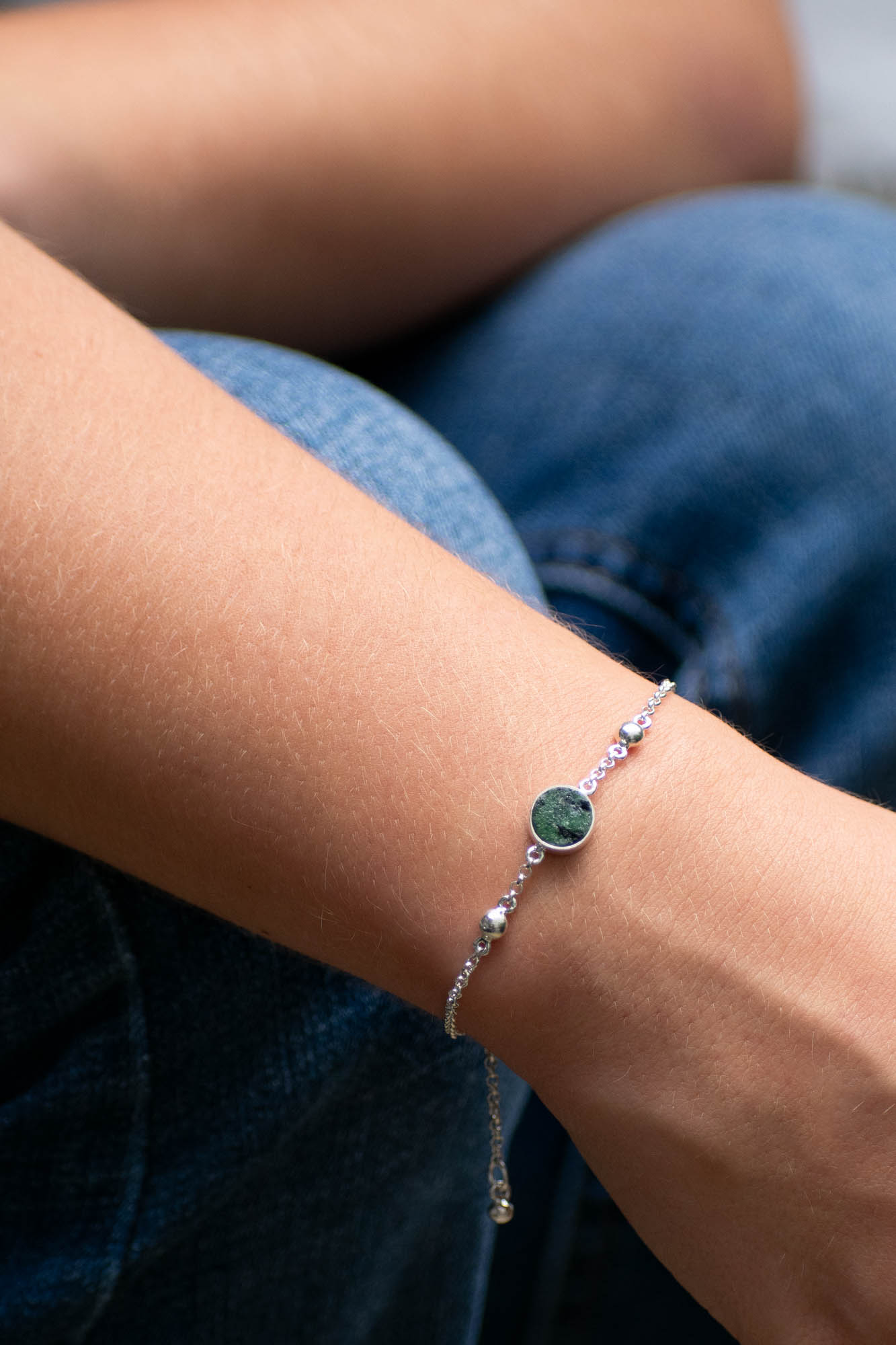 La pulsera GALAXIA, elaborada en plata, es una pieza que evoca la inmensidad del universo y la belleza de lo infinito. En el centro lleva zoisita, una piedra de carácter único, asociada a la transformación, la vitalidad y el crecimiento interior.